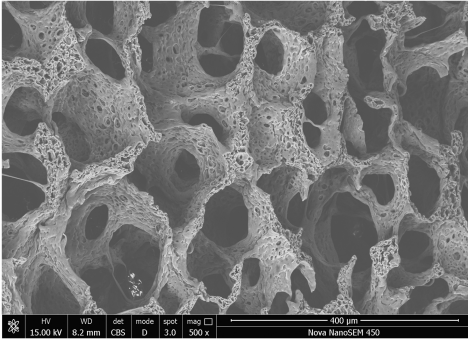 Spons PVA berwarna putih bersih, bersih, seragam, nyaman, dan sangat fleksibel, sehingga dapat digunakan secara luas untuk spons hemostatik ekspansif PVA, spons penyerap cair PVA, terapi luka tekanan negatif PVA. Proses produksi diterapkan melalui proses pembusaan gas bersih dan teknologi pemisahan fase, sehingga spons PVA menunjukkan bentuk gelembung bulat dan berpori di bawah mikroskop dengan SEM (mikroskop elektron pemindaian), dan dinding pori menunjukkan karakteristik "gelembung" yang jelas, yang pada dasarnya berbeda dari spons yang dihasilkan melalui proses pengisian pati. Kinerja produk seperti ukuran pori, kepadatan, fleksibilitas, dan kekuatan tarik dapat dikontrol dengan baik.